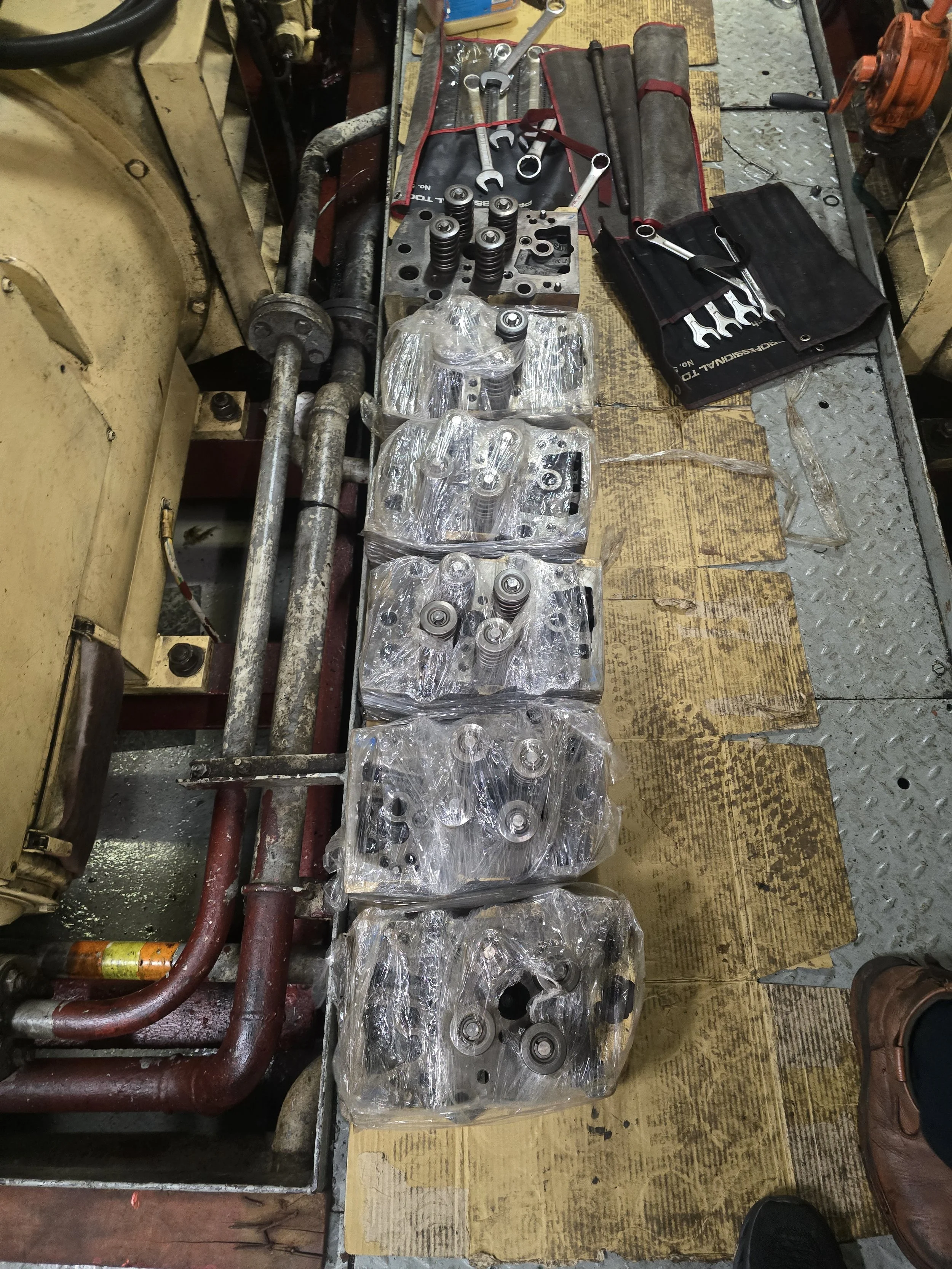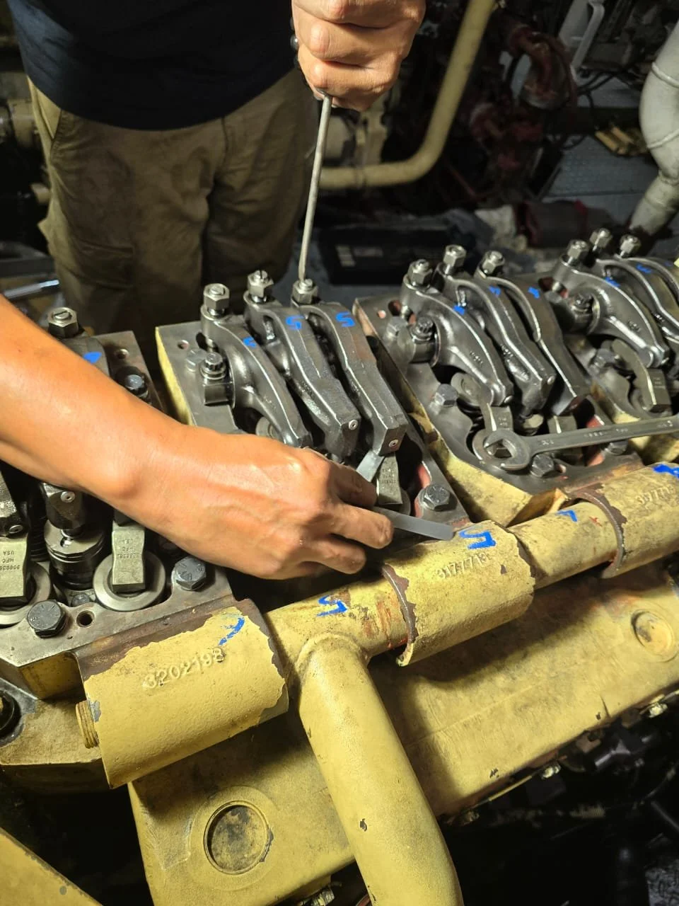Supported marine engine mechanical works including cylinder head removal, component inspection, overhaul support, reassembly activities, and valve train setting during planned maintenance execution.